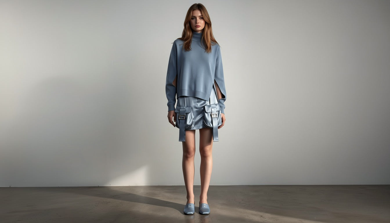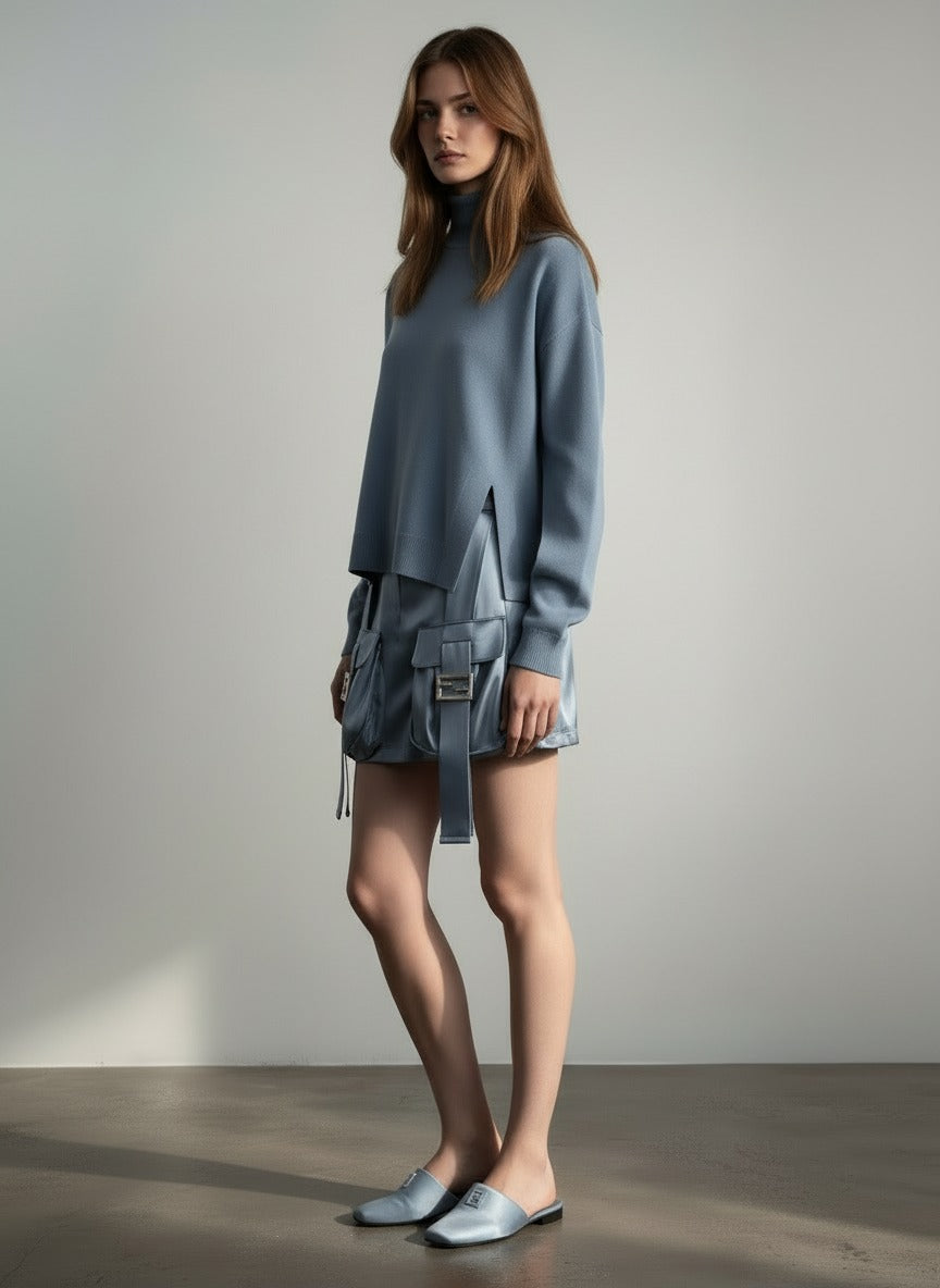 This iconic mini skirt is one of the most emblematic pieces from the Resort 2023 collection, which celebrated the 25th anniversary of the Baguette bag in New York under the creative direction of Kim Jones and Marc Jacobs. The garment reimagines the cargo concept through Fendi’s DNA, featuring 3D front pockets with graphite FF buckles that meticulously replicate the design of the world’s most famous "It-bag." Crafted from high-shine silk satin for a structured and luxurious drape, the skirt boasts a sharp, short cut with wide belt loops that reinforce the street-chic runway aesthetic, all while remaining in excellent condition.
