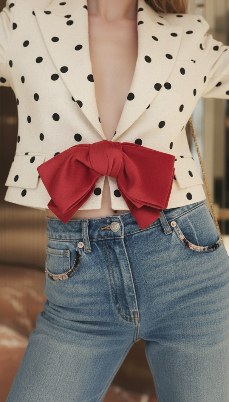 Featuring an impeccably structured cropped silhouette, the blazer showcases the classic polka dot pattern—an eternal Maison code—further elevated by a sculptural crimson satin bow that serves as the design’s poetic centerpiece. It is a masterclass in Italian tailoring, blending Michele’s signature historical romanticism with Valentino's legendary elegance.